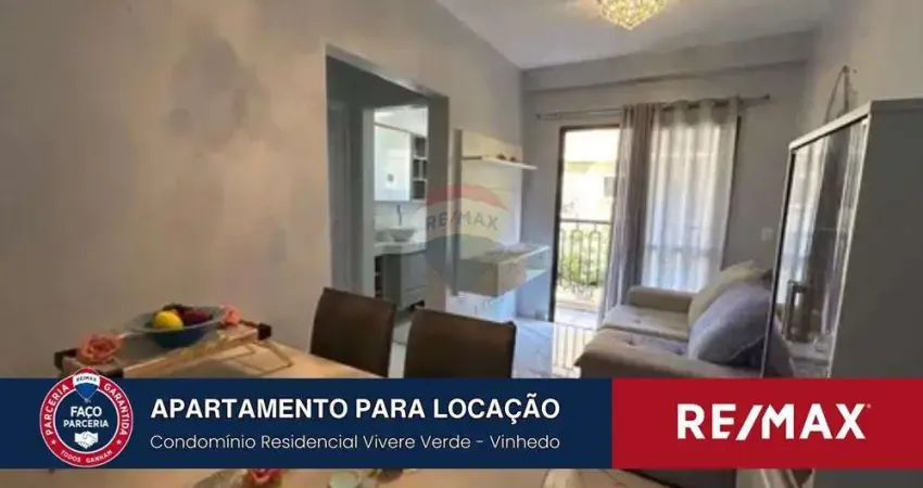 Apartamento MOBILIADO para alugar no condominio Vivere Verde- Vinhedo. sol da manhã, apartamento novo com sala para dois ambientes, sacada, sol da manhã, 55m², dois quartos sendo 1 suíte, 1 banheiro social, cozinha e área de serviço. Armários planejados na cozinha, banheiros e área de serviço. Os dois quartos tem armários modulados. Agua aquecida a gas.