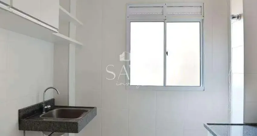 Apartamento moderno pronto para morar, com ótimo aproveitamento de espaço. A sala é integrada à cozinha americana, que conta com uma pequena bancada, armários nas paredes e mini área de serviço.
