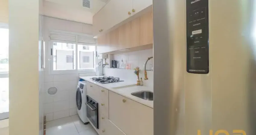 - Cozinha com armários planejados, possui cooktop, forno embutido e geladeira,