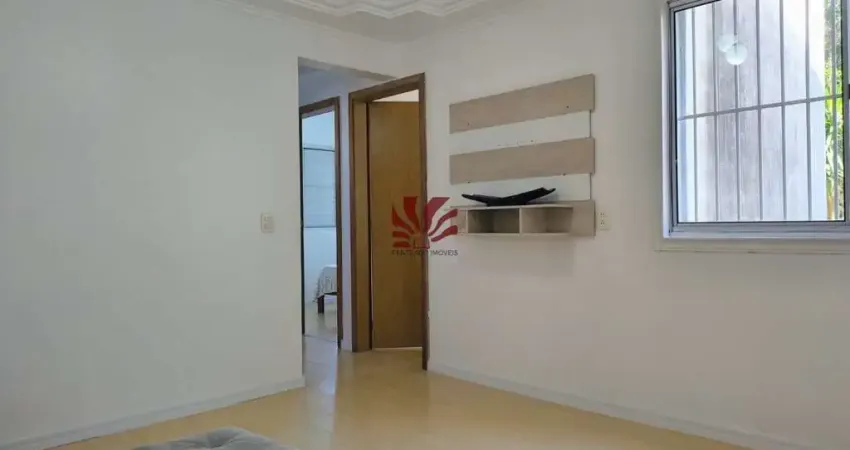 Penteado Imóveis aluga apartamento térreo semi mobiliado com 50m², localizado no bairro Igara, possui 02 dormitórios, sala de estar com sofá e painel de tv, cozinha com armários, geladeira e fogão, área de serviço, e banheiro social.