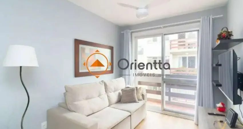 Apartamento com 70 m² de área privativa, apresentando um living aconchegante e moderno, mobiliado com sofá, mesa com cadeiras, rack, ventilador de teto e acesso à sacada, proporcionando um ambiente bem ventilado e convidativo.