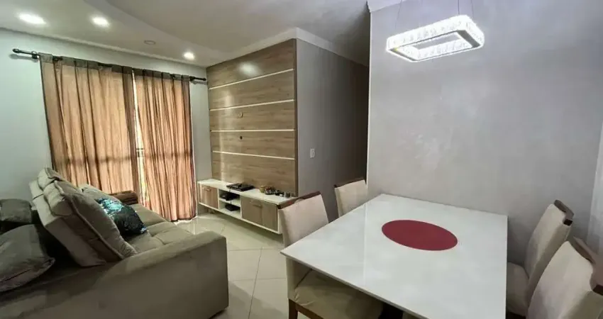 2 dormitórios com armários planejados, sala ampla em 2 ambientes, com painel de TV, cozinha planejada com armários, micro-ondas, fogão, exaustor, geladeira e mesa de jantar.