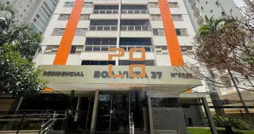 Apartamento para alugar no Edifício Residencial Boa Vista 37, Setor Bueno. Com 100m², possui 3 quartos, todos com armários, incluindo uma suíte. Além disso, possui um banheiro social, sala ampla para dois ambientes com sacada, cozinha repleta de armários, área de serviço com dependência e banheiro, e duas vagas de garagem. O condomínio oferece uma área de lazer com salão de festas.