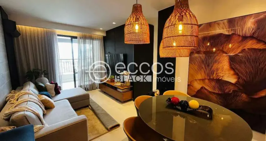 Apartamento totalmente mobiliado na região Sul de Uberlândia, com aproximadamente 103 m² de área privativa. Totalmente climatizado e com móveis planejados, o imóvel dispõe de sala ampla para dois ambientes, varanda gourmet com churrasqueira, três suítes, sendo duas semissuítes, lavabo, cozinha completa, área de serviço e duas vagas de garagem. O condomínio oferece portaria 24 horas, academia e área de lazer completa, proporcionando conforto, segurança e qualidade de vida.