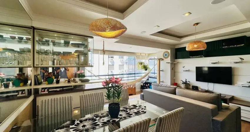 Apartamento mobiliado, com 99m² de área privativa, 3 dormitórios, 1 suíte, cozinha americana, living 3 ambientes, área de serviço com banheiro auxiliar.