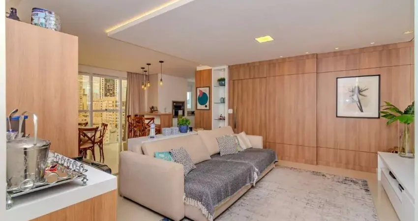 Com 120m² de área privativa e face sul, o apartamento é mobiliado, decorado e equipado, pronto para morar. Conta com living integrado, proporcionando amplitude e perfeita integração dos ambientes, além de cozinha funcional com churrasqueira à gás e área de serviço independente.