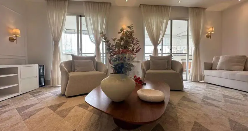 O apartamento totalmente mobiliado, espaçoso, área de serviço independente e 3 vagas de garagem no subsolo.