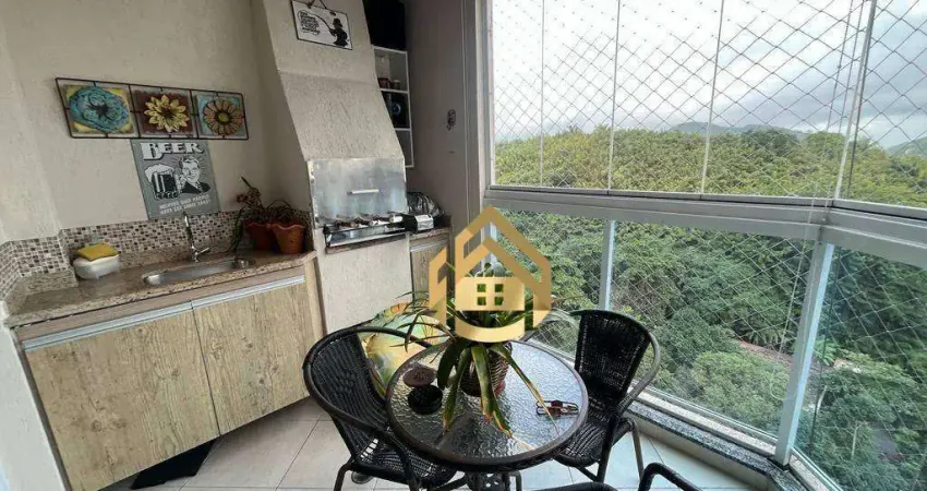 Apartamento com 118m² de área útil, totalmente mobiliado, com sala ampla e varanda gourmet com churrasqueira e vista parcial para o mar. Possui cozinha funcional, área de serviço, três dormitórios, sendo uma suíte, banheiro social e duas vagas de garagem.
