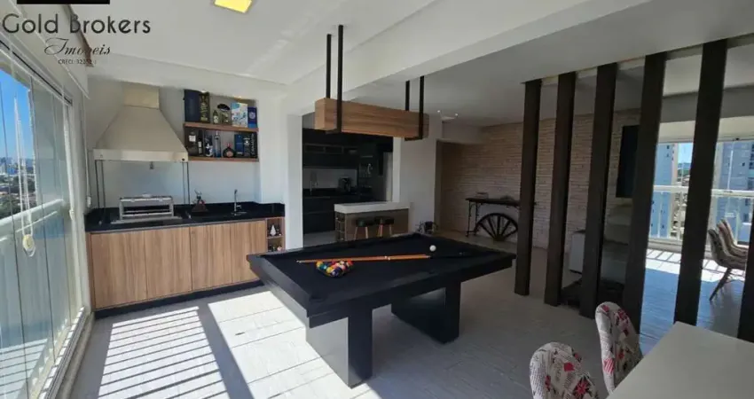 A varanda gourmet é envidraçada e equipada com churrasqueira e gabinete, proporcionando um espaço ideal para lazer e convivência. A cozinha segue o conceito aberto, rica em armários planejados e equipada com eletrodomésticos, integrada à área de serviço.