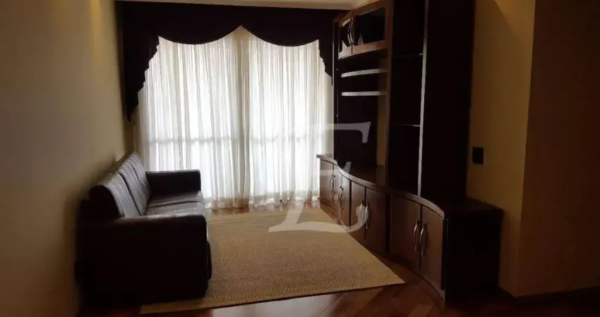 São 100 m², com 3 dormitórios (1 suíte), sala de estar e jantar, cozinha equipada, área de serviço com banheiro de empregada e 2 vagas de garagem em linha.