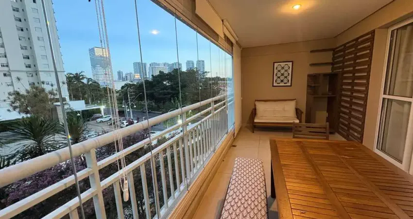 A varanda gourmet é um destaque especial: churrasqueira com gabinete decorado, fechamento em vidro com cortina rolon, mesa de madeira para até 6 pessoas mais um banco para 2 pessoas almofadado, quadro decorativo e espaço planejado para barzinho em madeira, com suporte para copos, bebidas e nicho preparado para frigobar.