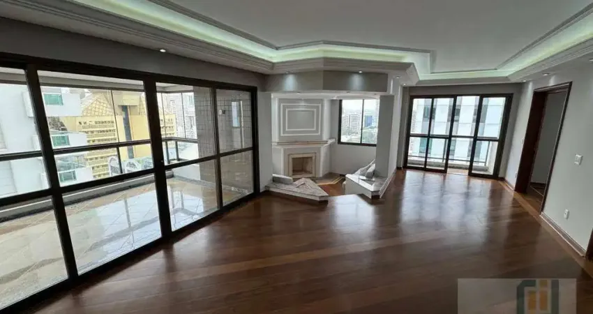 Apartamento para locação no Condomínio Edifício Chateau, em Alphaville. Conta com 288 m² de área útil, 4 dormitórios sendo 2 suítes, suíte master com banheira de hidromassagem, amplo living com sala de estar e sala de jantar, lavabo, lareira, cozinha repleta de armários planejados, área de serviço com lavanderia, varanda, andar alto, depósito e 4 vagas cobertas de garagem.