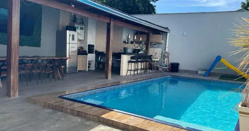 A casa possui sala com dois ambientes integrados, ampla cozinha repleta com armários e varanda Gourmet, piscina aquecida de 7m, garagem para dois carros, lavanderia e banheiro na área externa.