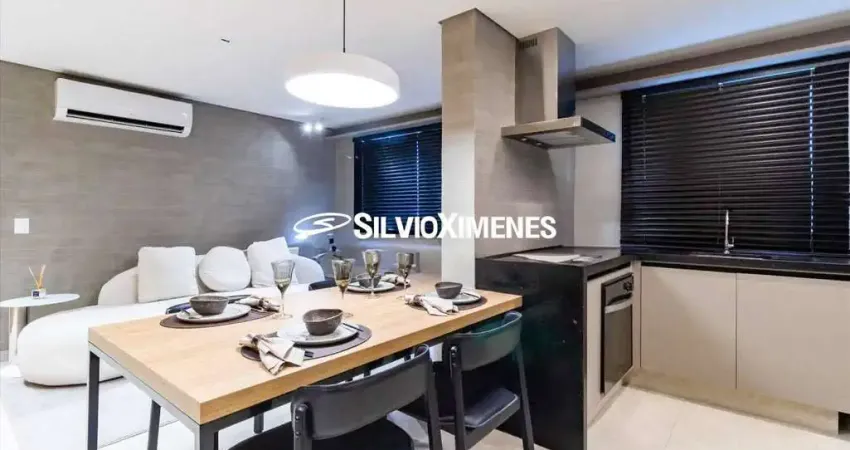 Lounge gourmet decorado e climatizado.