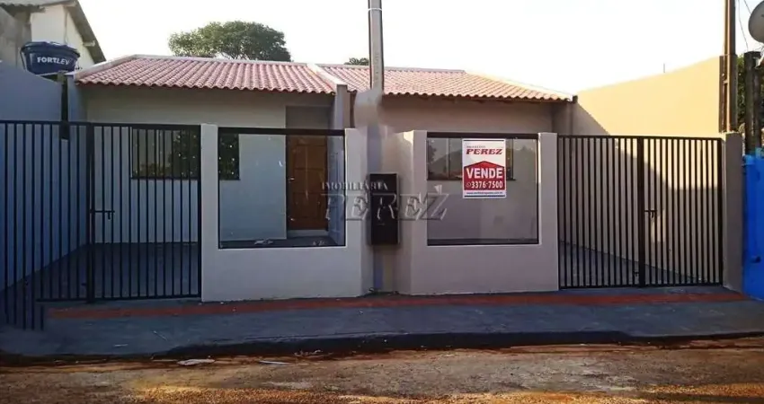 Casa geminada com 2 dormitórios, sala em ambientes, wc social, cozinha, área de serviço, garagem e fundos com área coberta.