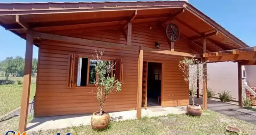 Chalé misto em alvenaria com: 02 dormitórios, 02 banheiros, sala de estar com lareira e cozinha conjugadas, churrasqueira, área de serviço, vaga coberta para carro e pátio cercado. - 162,50m² de terreno