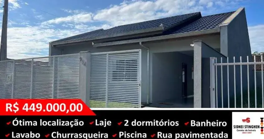 Conforto e lazer: casa com laje, piscina e área com churrasqueira.