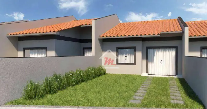 Geminada térrea em construção, 02 dormitórios, sala e cozinha integradas, área de serviço, banheiro social e vaga de garagem.