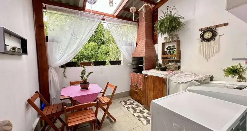Sobrado: * 02 dormitórios; * Churrasqueira: * Cozinha; * Lavabo; * Sala de estar/jantar; * Área de serviço; * 02 vagas; * Piso cerâmico; * Infraestrutura para ar condicionado; * Portão eletrônico; * Fica os móveis.