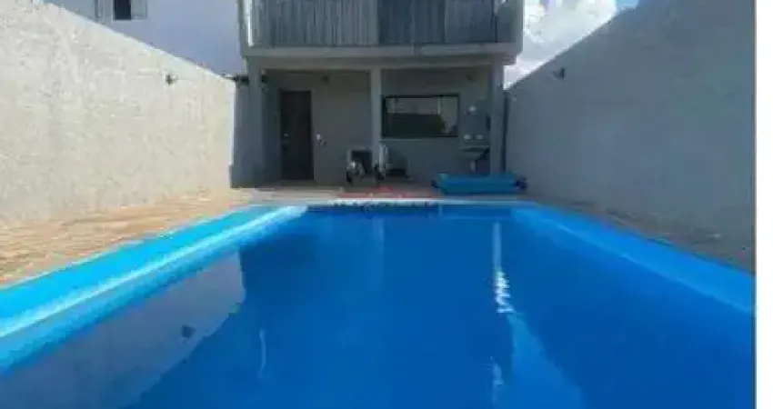 Casa com 2 dormitórios, sendo 1 suite, cozinha ampla, lavabo e sala, piscina, banheiro externo e área coberta para uma churrasqueira.