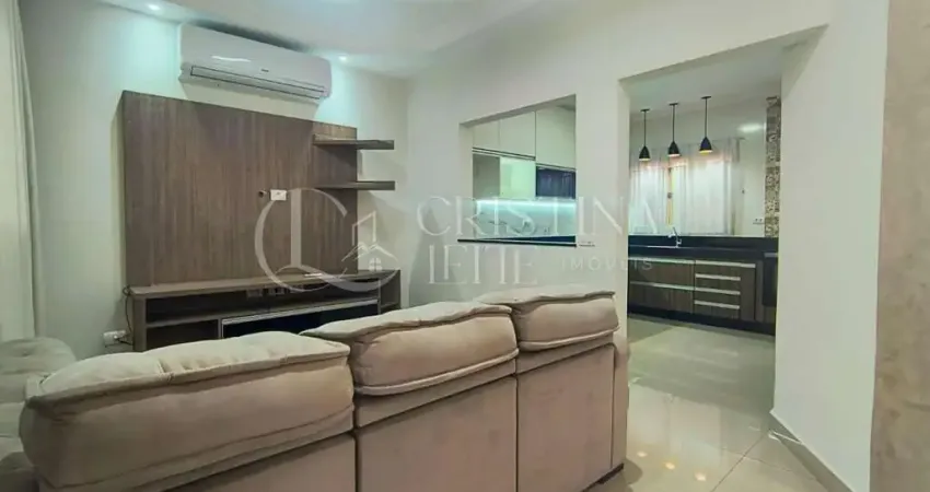 Sala de jantar integrada à sala de TV, com painel, sofá inclusos e ar condicionado de 24 BTUs instalado, ideal para reunir a família e receber amigos com conforto