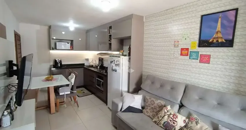 Casa geminada com 49m² de área construída. O imóvel possui 2 dormitórios, sala integrada com cozinha, 1 banheiro, uma área de lavanderia e uma vaga de garagem para um carro.