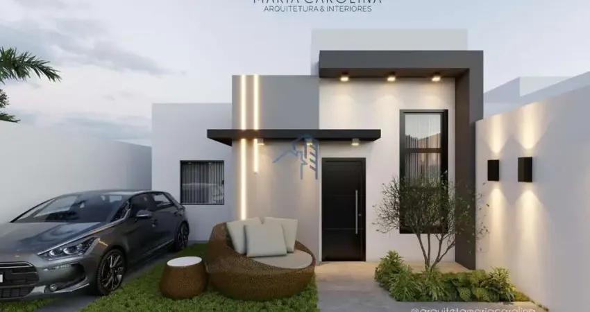 Casa térrea, com 3/4 (sendo 1 suíte), sala com pé direito alto, cozinha integrada e área de serviço, banheiro social, quintal e garagem, com corredor na lateral e no fundo.