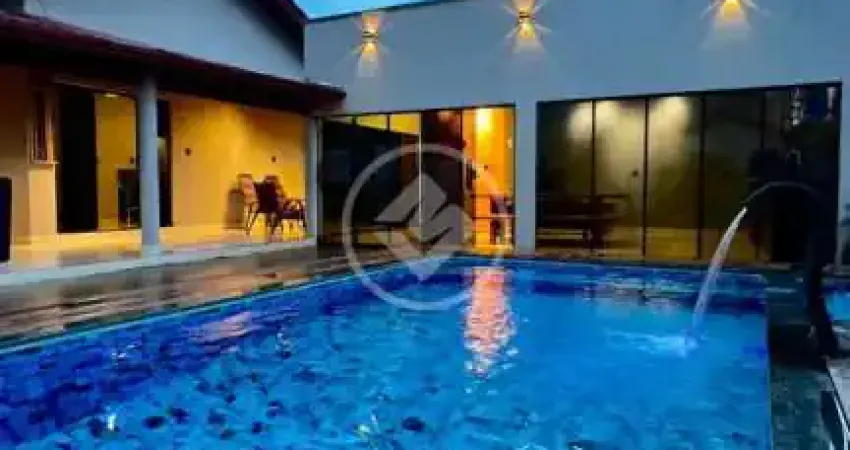 Piscina grande com deck de madeira, hidromassagem, aquecedor e iluminação.