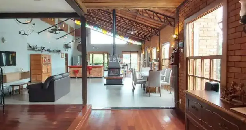 Excelente casa de 250m², 3 quartos sendo 1 suíte, 1250m² de terreno murado, salão com pé direito duplo tudo integrado, lareira e fogão à lenha com chapa naval e forno embutido, parte do piso em tábua corrida, teto rebaixado em gesso, janelas e portas em cedro, piso jatobá, parede com detalhe em tijolo aparente, salão com 6 ambientes e lindo visual, cozinha integrada com fogão embutido, bancada celestone, gás encanado e varanda com piso porcelanato, divisa com área de preservação permanente; churrasqueira na varanda com chapa naval e pia em granito preto; banheiro com piso e parede em porcelanato e teto rebaixado em madeira; despensa com piso porcelanato e prateleiras em mármore; lavanderia com 2 áreas externas descobertas; mezanino com acesso à sala de música/TV, piso laminado tábua corrida, teto rebaixado em maderia, parede com detalhes de tijolo aparente com acesso à varanda tipo mirante; conceito de natureza, qualidade de vida; banheiro social com banheira de hidromassagem, piso em ladrilho hidráulico, pia em granito, box blindex e espelho; casa toda linear; 1° quarto com piso tábua corrida laminado, porta e janela maciças em cedro; 2° quarto com piso tábua corrida laminado, porta e janela maciças em cedro; 3° quarto com piso tábua corrida, ar condicionado e suíte com piso porcelanato, pia em granito, gabinete, box blindex, armário embutido; internet fribra; TV a cabo, em plena rua Manaus; quintal todo gramado, pomar, canil, piscina, garagem descoberta para 4 carros e coberta para 2 carros.