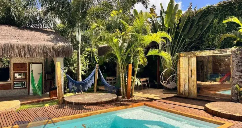 O jardim é um espetáculo à parte. Verde abundante, texturas, sombras, caminhos e um lago vivo, com peixes, onde é possível entrar, sentir a água, estar junto da natureza de forma literal, quase meditativa. Um convite diário ao silêncio, à contemplação, ao desacelerar. Ao lado, a piscina de sal aquecida completa essa experiência de resort particular um quintal que não serve apenas para ver, mas para viver.