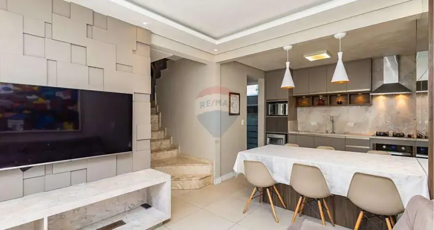 No primeiro pavimento, o imóvel oferece uma cozinha ampla com móveis planejados e uma sala de estar/jantar integrada, ambas revestidas com porcelanato de alta qualidade. A iluminação indireta da sala proporciona um clima aconchegante e sofisticado. Conta ainda com lavanderia separada, área com churrasqueira a carvão, pia e armários planejados, além de mesa com banquetas, tornando o espaço perfeito para confraternizações. A área de serviço é totalmente equipada com armários amplos e funcionais, que facilitam a organização e o armazenamento de utensílios. O pavimento se completa com garagem, garantindo praticidade e conforto no dia a dia.