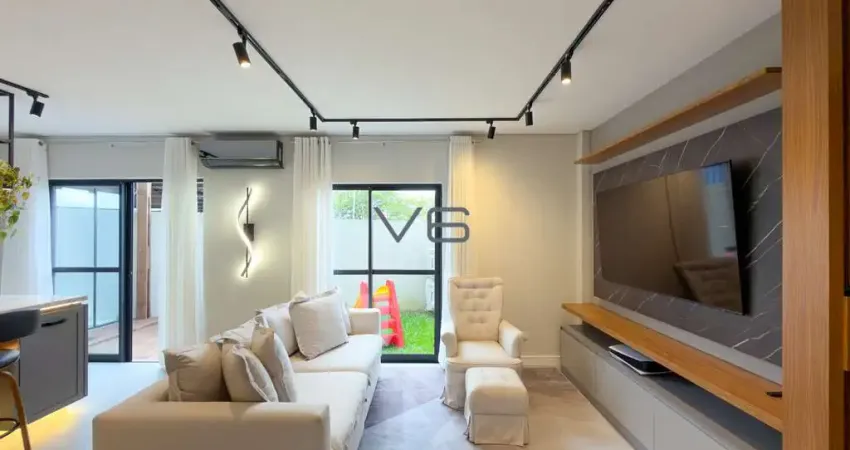 •Pavimento Térreo: Composto por sala de estar com painel planejado e sofá, cozinha completa com ilha gourmet (incluindo 3 banquetas), lavabo e um diferencial: living com teto de vidro e deck externo com pequena área verde integrada à sala.