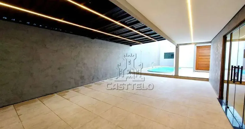 Sala ampla , conceito aberto, sendo de um lado Espaço Gourmet, com churrasqueira, com porta de vidro para a piscina e do outro lado ,cozinha com armários planejados, além de lavabo.