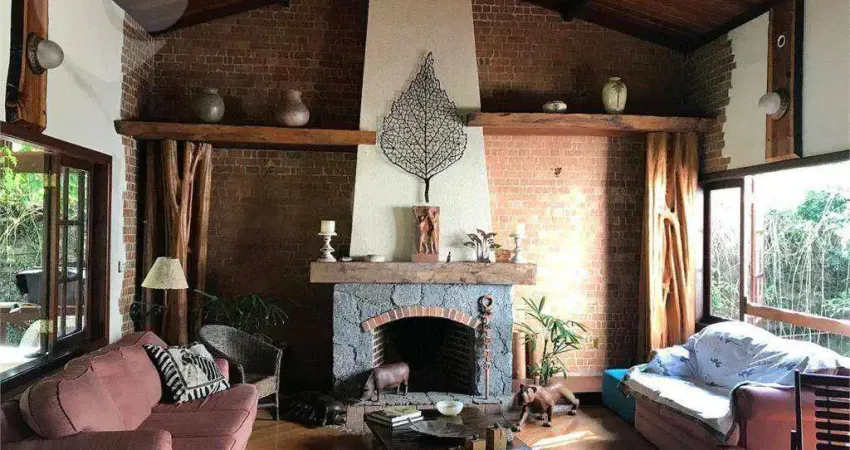 Linda residência em um amplo terreno, com 3 suítes com varanda, sala de jantar com lareira e deck de madeira, sala de estar e outra de tv.