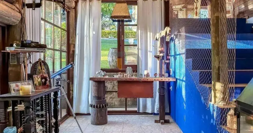 c/ 2 dormitórios, sendo uma suíte, banheiro social, sala de estar/jantar c/ lareira e cozinha. Salão de festas c/ 1 suíte, lavabo, sala de estar, cozinha equipada c/ churrasqueira e fogão campeiro. Varanda, ampla área externa c/ árvores, piscina e pergolado. Garagem coberta para 3 carros. Condomínio c/ estrutura de lazer completo, lago c/ pedalinho, restaurante e segurança 24 horas! Aproveite esta oportunidade e marque sua visita no local, confira!