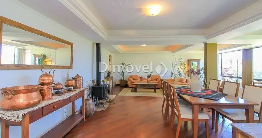Casa térrea com 3 dormitórios sendo uma suíte, e closet, living para 3 ambientes amplos, lavabo, gabinete, cozinha montada com piso aquecido, depósito, dependência de empregada, adega, pátio com piscina e churrasqueira, garagem para 4 carros, vista rio.