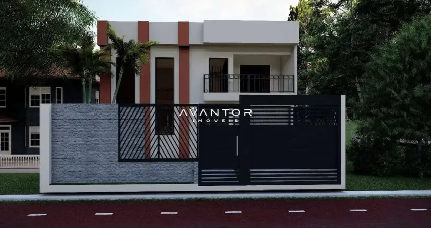 O imóvel está em fase de alvenaria do primeiro pavimento, já com todos os tijolos comprados e estocados para a continuidade da obra. A residência foi projetada para unir amplitude, luminosidade natural e praticidade.