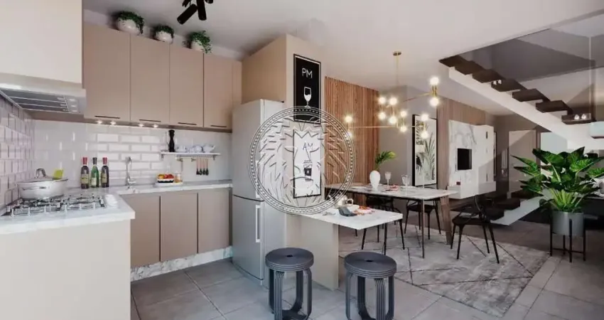 No piso inferior, possui sala de estar, cozinha integrada com espaço de jantar, lavabo e varanda gourmet.