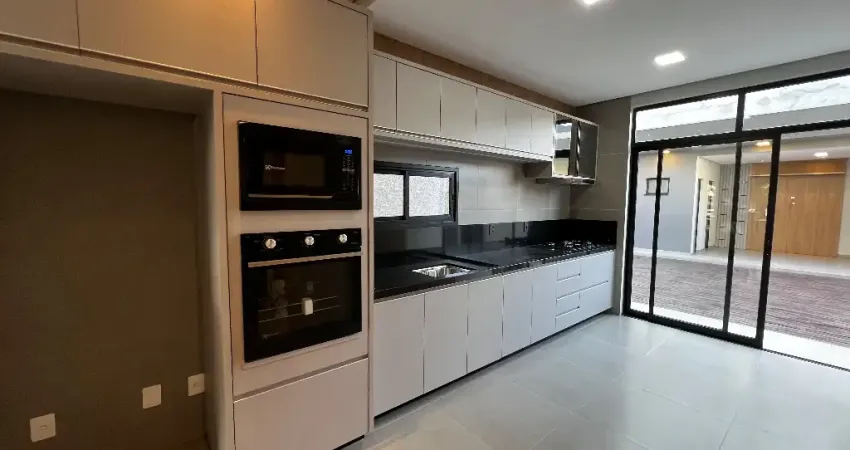Acabamentos de alto padrão: porcelanato classe A, teto rebaixado em gesso, esquadrias em alumínio Suprema, portões de elevação em alumínio preto e persianas integradas.