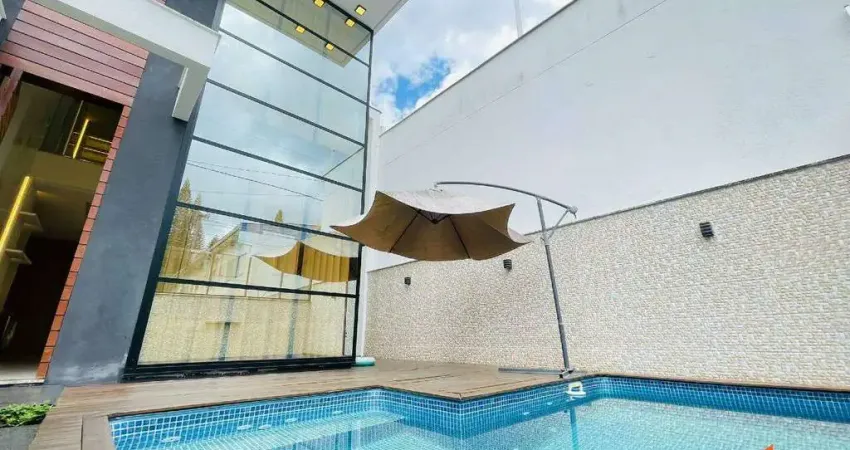Casa: com terreno de 13,00 x 29,38 metros, totalizando 429m², e 202,99m² de área construída. Casa ampla, bem distribuída e com excelente padrão de acabamento. Conta com 03 suítes espaçosas, sendo uma suíte master com banheira. Imóvel semi-mobiliado, com móveis sob medida, rebaixo em gesso, porcelanato e acabamento de alto padrão. Possui sala de estar e jantar integradas à cozinha totalmente mobiliada e também possui uma sala no piso superior, lustres e pedras nobres. Dispõe ainda de dois lavabos muito elegantes. A área de festas é completa, mobiliada, com churrasqueira gourmet e acesso direto à piscina, ideal para momentos de lazer. O imóvel conta com passagem lateral modernidade e valorização ao projeto. Dispõe de 04 vagas de estacionamento, casa em excelente estado de conservação.