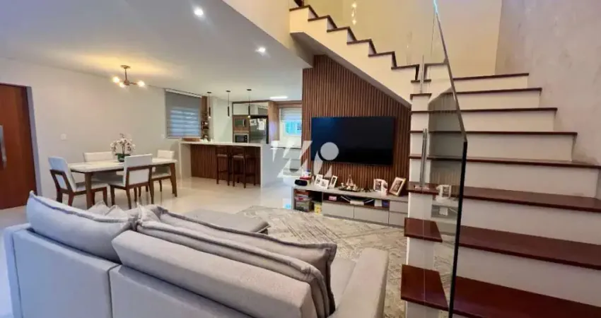 A casa possui três dormitórios, sendo uma suíte, além de um home office, banheiro social no pavimento superior, lavabo no térreo e um banheiro externo junto à área da piscina. A sala de estar é integrada à sala de jantar e à cozinha, proporcionando um ambiente amplo e funcional, e a área de serviço é independente.