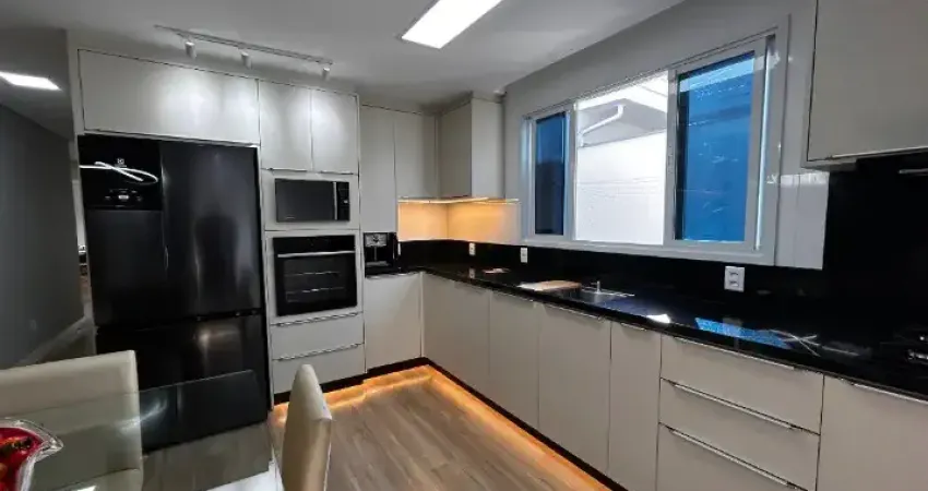 Casa Pedra Branca, com 3 dormitórios sendo 2 suítes, sala integrada com a cozinha, área de serviço, espaço gourmet com churrasqueira, edícula, banheiro social e 3 vagas de garagem.