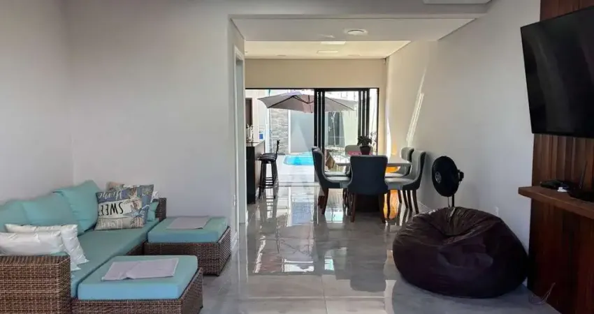 Casa com área construída de 138m². O imóvel possui 1 suíte e 2 quartos, 2 banheiros, sala de estar/jantar, cozinha planejada com eletrodomésticos e área de churrasqueira com mesa e cadeiras. Conta com 3 vagas de garagem e lavabo.