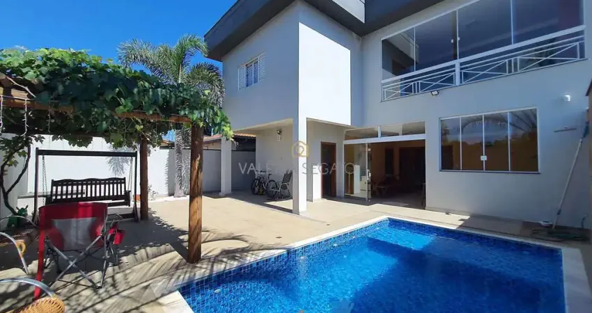 Ainda no piso inferior encontra-se a cozinha com armários e adjacente a esta uma espaçosa área gourmet com churrasqueira, fogão cooktop e armários, fechada por blindex com vista para o quintal com uma deliciosa piscina com cascata, pergolado coberto por uma videira e coqueiros que dão um charme especial a este espaço de lazer.