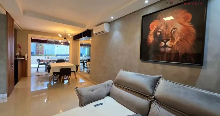 No térreo: lavabo, sala de estar com ar condicionado integrada a sala de jantar, ampla cozinha com planejados, área gourmet com churrasqueira, planejados, banheira de hidromassagem e 2 vagas