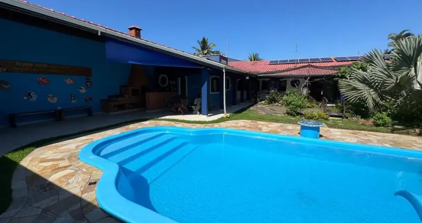 Casa localizada lado praia a 100 metros do mar em rua calçada, possui area de serviço, jardim, piscina e espaço gourmet com churrasqueira