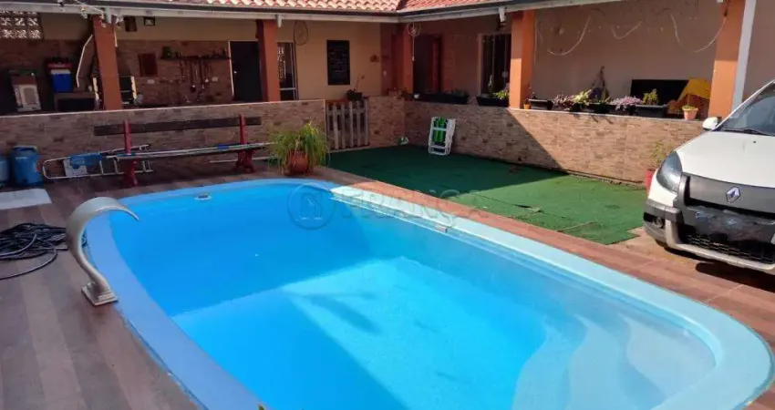 Casa com 3 dormitórios, sendo uma suíte, sala e cozinha integrada, despensa, churrasqueira, piscina e vagas de garagem para vários carros.