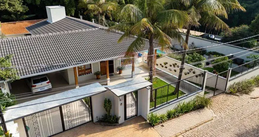 No pavimento inferior, há um escritório ideal para quem trabalha em home office, além de lavanderia, sala de descanso, mais um banheiro, área gourmet com churrasqueira, fogão a lenha e uma área de lazer completa com piscina, perfeito para momentos de diversão e relaxamento. A casa também conta com um pomar, jardim bem cuidado e uma edícula de 3 cômodos, oferecendo ainda mais espaço e conforto.