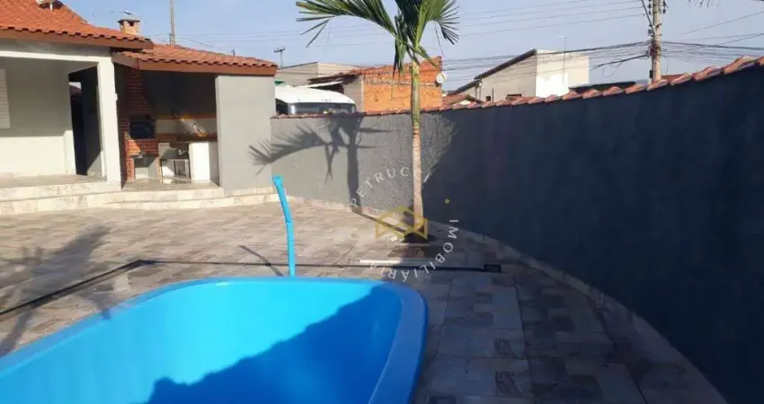 A casa ainda conta com quintal amplo, piscina e churrasqueira e banheiro externo.