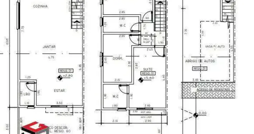 São 96 metros de área construída + 15 m² de quintal. Na parte térrea, temos 2 vagas de garagem. No 1° pavimento, sala de jantar/estar, lavabo, cozinha americana, área de serviço e quintal, tudo pronto para instalação de uma churrasqueira. No 2° pavimento, são 3 quartos, um deles suíte, e 1 banheiro social. A casa vai receber todo o sistema para instalação de ar-condicionado e água quente.